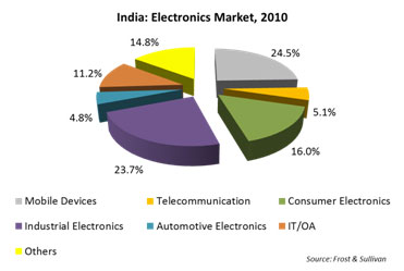 The Indian electronics industry was estimated to be $65.1 billion in 2010 growing at over 27 percent from 2009. Chart 5.1.2.a below presents the contribution of different segments to the Indian electronics industry in 2010.